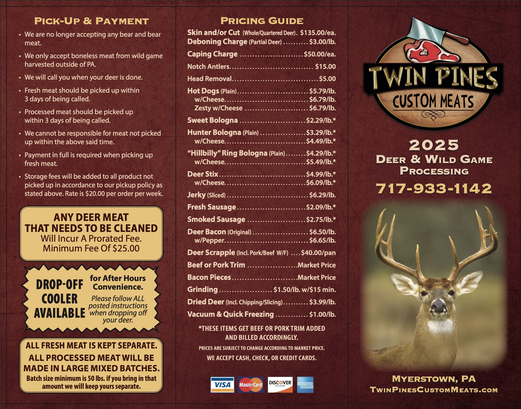 During the off-season, please call ahead before dropping off deer. The deer drop-off cooler is not open 24/7 during this time.