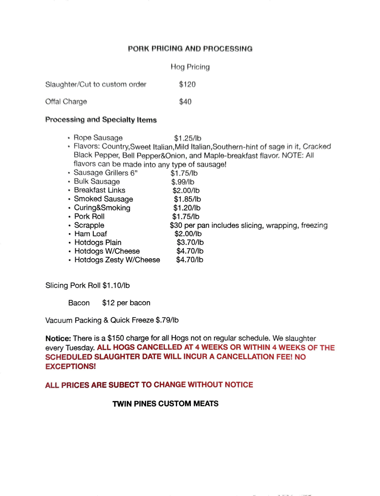 At Twin Pines Custom Meats, we take pride in offering comprehensive processing services for your beef and pork. Our process includes slaughtering, cutting, wrapping, and quick freezing to ensure that your meat is handled with care from start to finish.